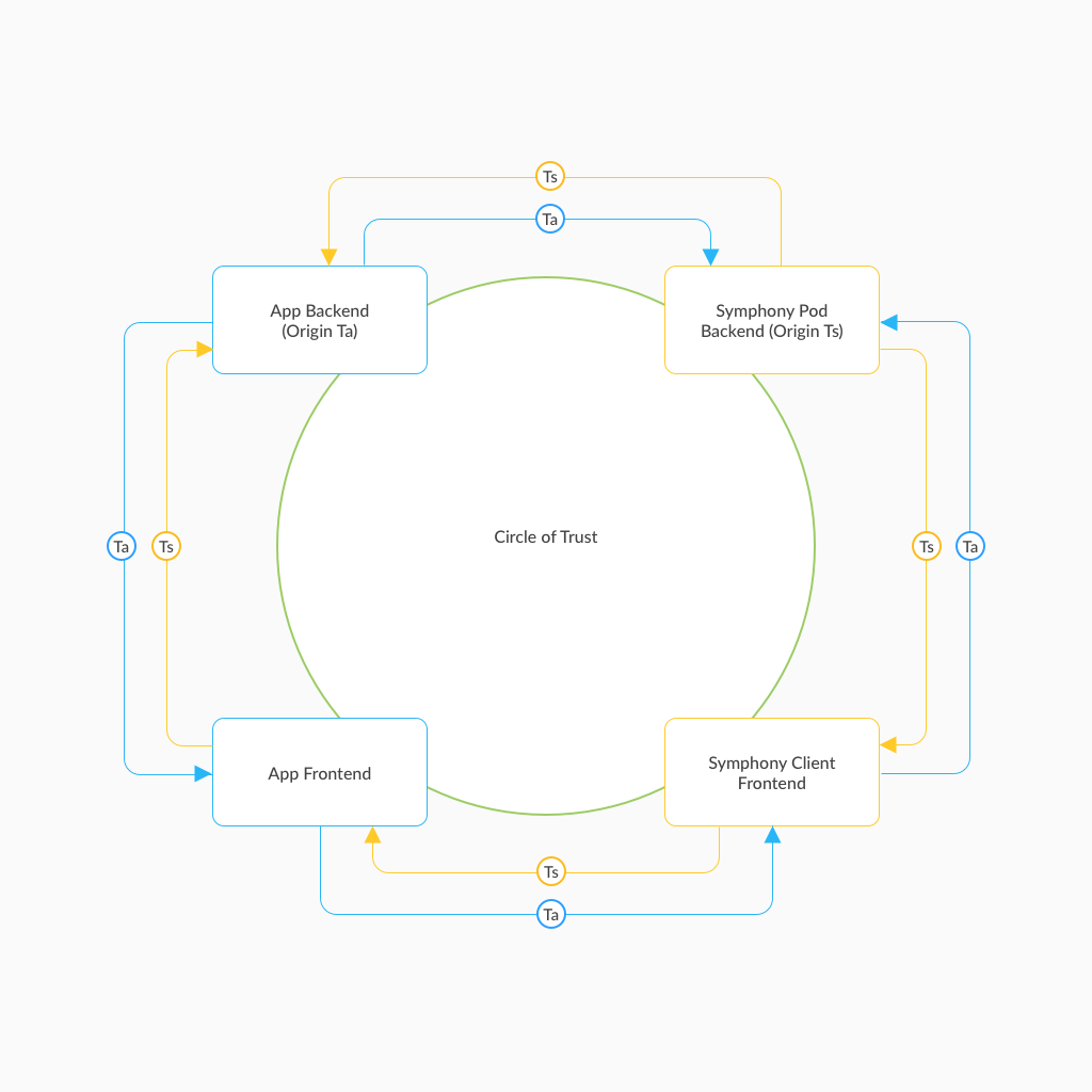 The flow utilizes two tokens, Ta and Ts, which are generated by the app and Symphony backends after the servers mutually authenticate each other using certificates. A circle of trust is established by passing the tokens in opposite directions so that each backend server receives matching tokens via two separate paths.